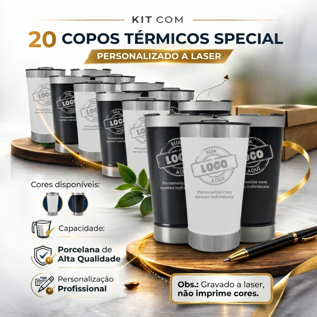 Kit composto por 20 copos térmicos special em inox. Cores disponíveis: branco e preto.
