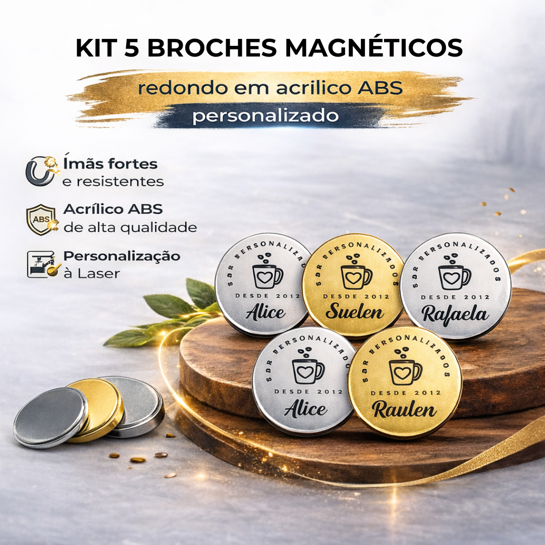 Os Broches Magnéticos que a S & R Personalizados oferece, são fabricados em acrílico ABS preto com revestimento na cor branca, prata escovado ou dourado. A técnica de personalização é gravação a laser, onde a gravação fica na cor preta.